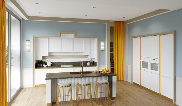 Выбирая кухонный комплект мебели, учитывайте то, в каком стиле она выполнена. Например, для просторной комнаты подойдет классическая версия с роскошным декором – лепниной, позолоченными элементами, резными узорами, патиной.