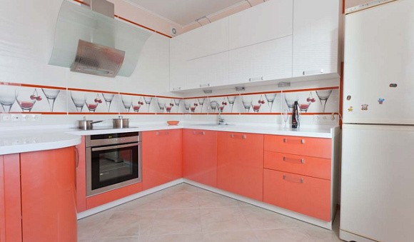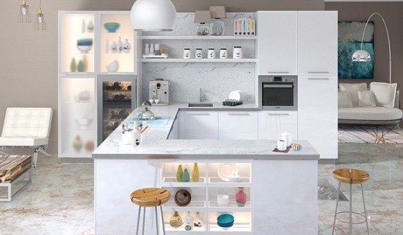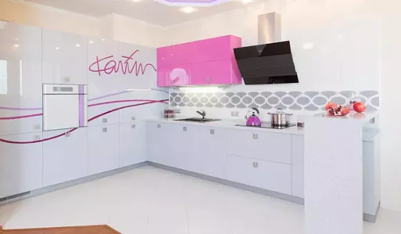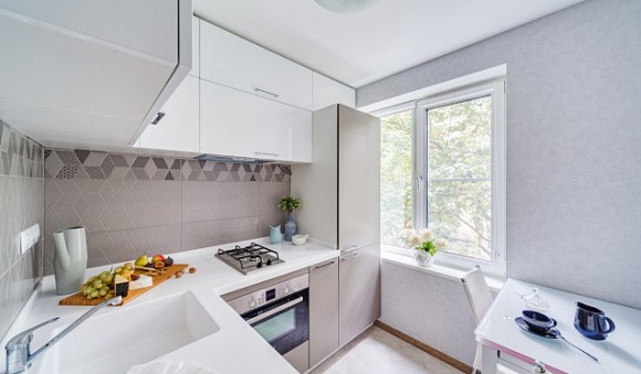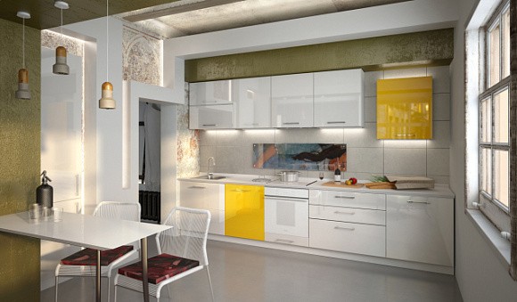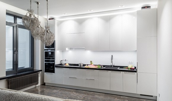 Версия с белыми фасадами идеально встроится в компактную комнату. Подобный кухонный гарнитур в сочетании со светлыми стенами, полом и потолком позволит добиться визуального расширения пространства. Происходит это благодаря тому, что белоснежные поверхности отражают солнечные лучи, увеличивая количество света в комнате. Особенно хорошо этот эффект работает с глянцевыми текстурами.