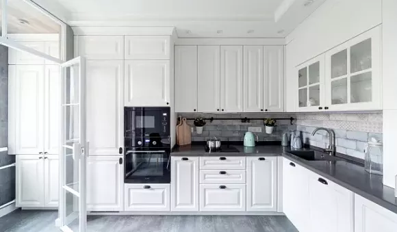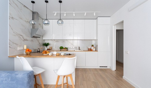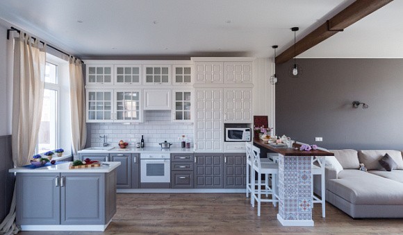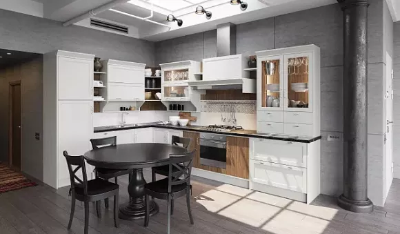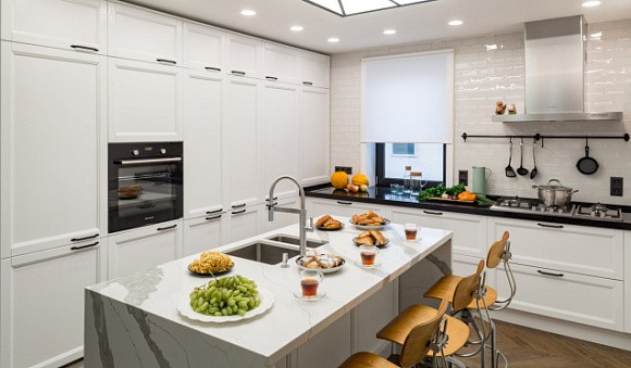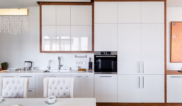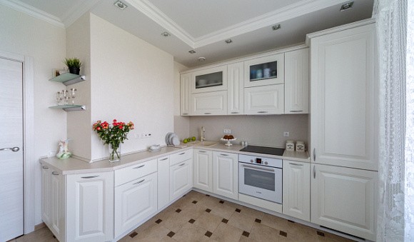 Для просторной квартиры с большими окнами и высокими потолками подойдет классическая белая кухня. Модель такого типа можно узнать по симметричным линиям, простым формам и роскошному декору. Фасады кухонной мебели в стиле классика оформляют лепниной, позолотой, резными узорами, патиной.