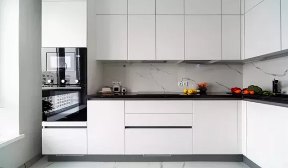 Эстетичность. Кухонная мебель с белоснежными фасадами смотрится благородно и дорого.