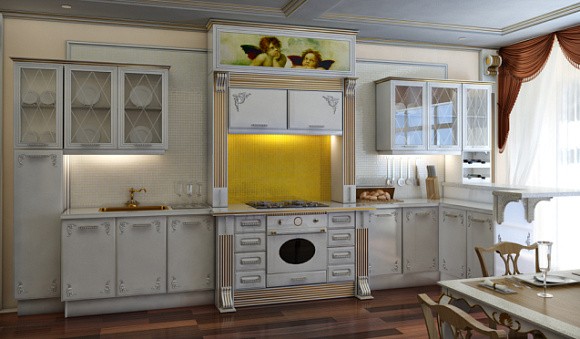Любителям роскоши понравится модель в стиле барокко. Подобные кухни в белых тонах декорируют ажурными деталями, фигурными карнизами, скосами. Столешница подобного гарнитура должна смотреться дорого и изысканно. Поэтому для ее изготовления используют натуральный или искусственный камень, древесину дуба или бука.