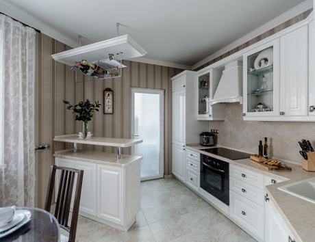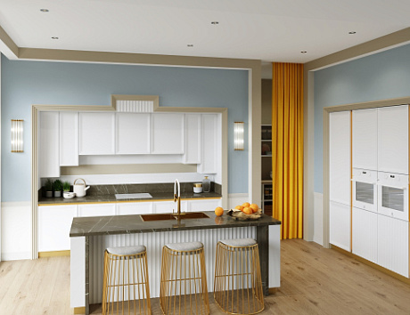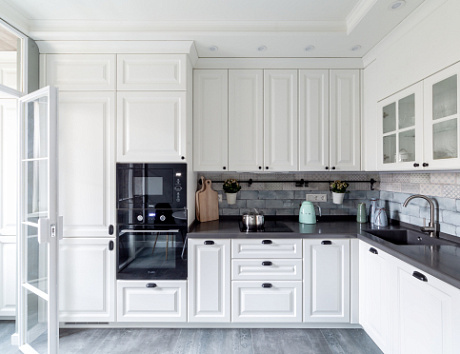 Неоклассика сочетает в себе классические мотивы и практичность модерна. Подобные кухни особенно хорошо смотрятся в больших помещениях. Конечно, можно подобрать неоклассический кухонный гарнитур и для более компактной комнаты. В этом случае следует использовать зеркальные и стеклянные вставки, открытые навесные полки вместо навесных шкафов.