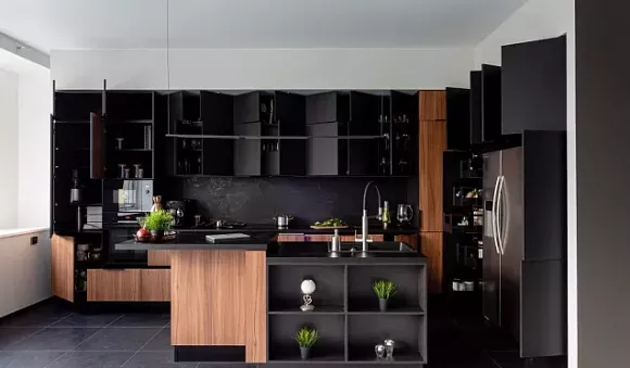 • При подборе кухонного гарнитура учтите, что у него должны быть гладкие прямоугольные фасады без ручек. К такой мебели идеально подойдет столешница из натурального или искусственного камня. В редких случаях она может быть изготовлена из древесного массива. Для дополнения черной мебели используйте бежевую, серую или белую отделку.