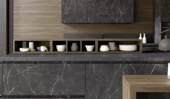 В кухонном углу устанавливают черную столешницу, которая способствует созданию дорогого, солидного и благородного интерьера. Для оформления красивого основания применяют каменную крошку, блестки или перламутровые вкрапления.