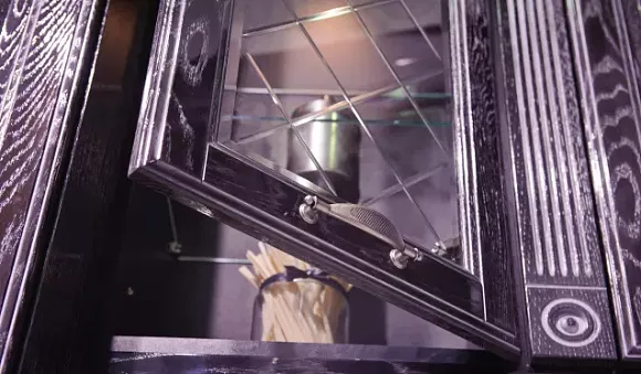 Темное кухонное пространство хорошо выглядит со шкафами, у которых есть стеклянные вставки. Иногда на кухне устанавливают черный обеденный стол или исключительно темные стулья.