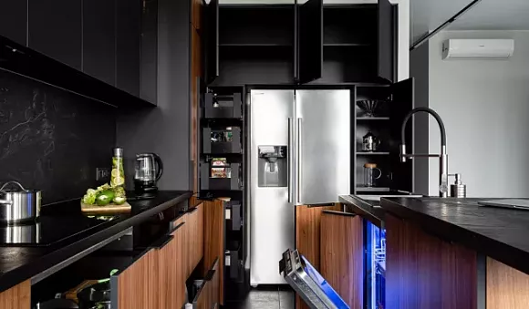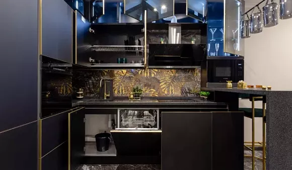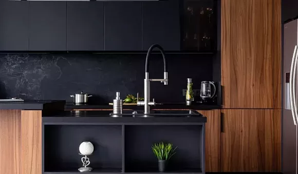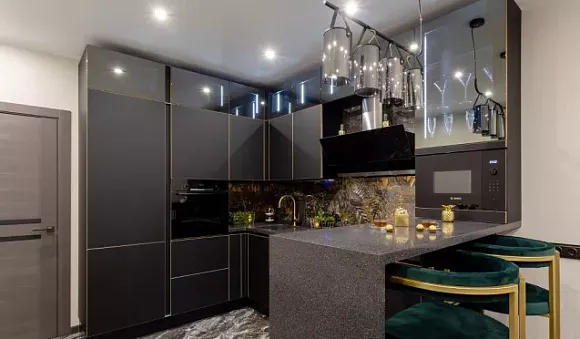 Черная кухня – один из актуальных трендов, который можно использовать в качестве основы дизайнерского решения. Такой вариант выглядит неординарно и шикарно на большой площади, например, в квартирах с планировкой студии. Для небольшого помещения подойдет комбинированный вариант кухонного гарнитура, дополненный: