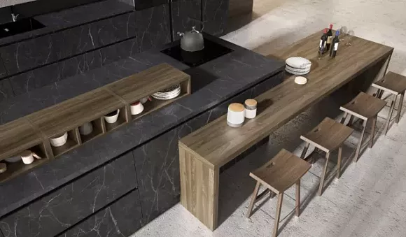 Подбирая кухню в черном цвете, рекомендуется обратить внимание на матовые варианты. Идеально подойдет поверхность, в которой через краску будет виднеться деревянная текстура. Также рекомендуется использовать деревянную мебель с грубой обработкой.