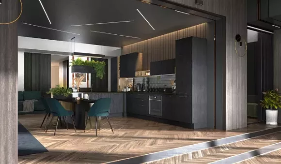 • Рекомендуется выбирать черную кухню в современном стиле. Лучше всего, если фасад будет прямоугольной формы со скрытыми элементами фурнитурами. В зависимости от пожеланий заказчика можно выбирать глянцевую или матовую поверхность.
