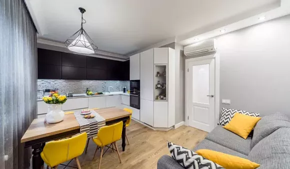 • Черно-серый гарнитур будет хорошо смотреться с пастельными оттенками.