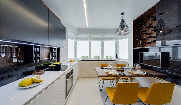 Черные линейные гарнитуры практичны и устанавливаются вдоль любой стены. Такой дизайн гармонично смотрится в соседстве с обеденной зоной.