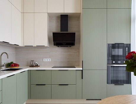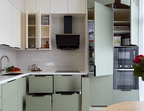Многие современные проекты включают пеналы или колонны — это высокие шкафы, которые доходят почти до потолка. Их преимущество в том, что они позволяют разместить сразу несколько функциональных зон: встроенную технику, полки для хранения продуктов, выдвижные системы.