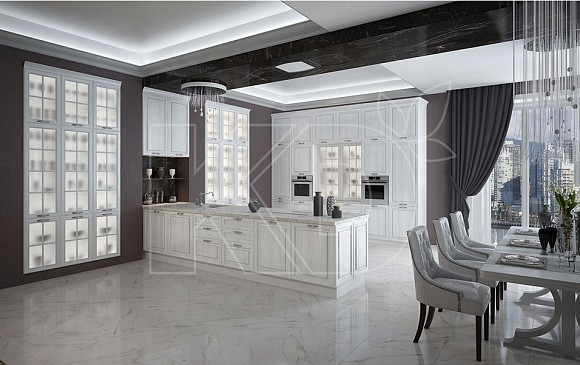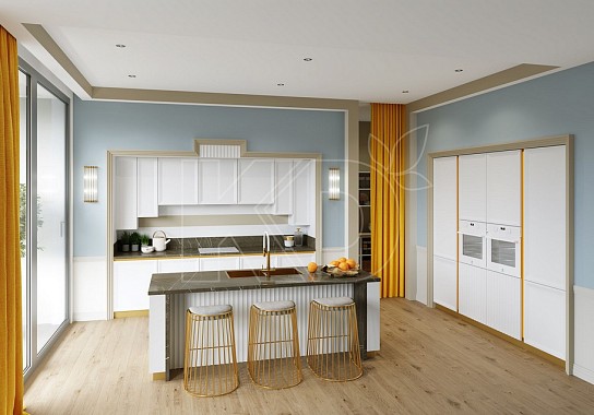 Дизайн классической белой кухни подразумевает элегантную симметрию и обилие декора. Гарнитуры украшают балюстрады и резьба, лепнина и витражи. На белоснежном фоне особенно изысканно смотрятся узоры из золотистой патины, создающие в помещении атмосферу роскоши и достатка. Фасады мебели могут иметь как матовое, так и эффектное глянцевое покрытие.