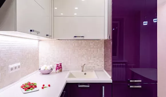 Именно белый цвет считается отличным решением для оформления небольших кухонных помещений, так как при его использовании пространство визуально расширяется, а также увеличивается количество света, особенно при использовании в интерьере фиолетовых поверхностей.