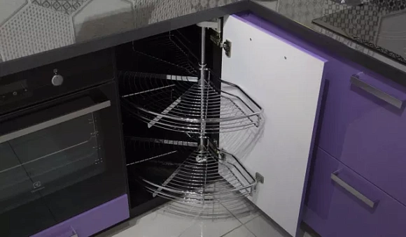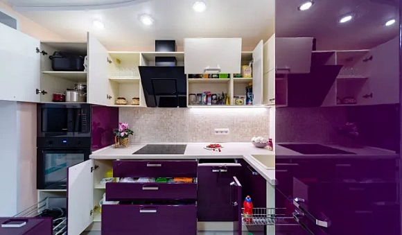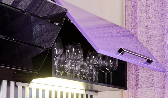 Рассматриваемые кухни фиолетовых цветов в каталоге кухонь на сайте изготавливаются на специализированном современном оборудовании с использованием передовых технологий. Благодаря этому гарнитур отличается наличием: