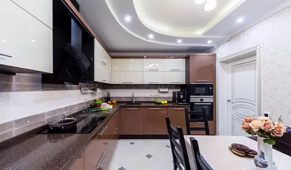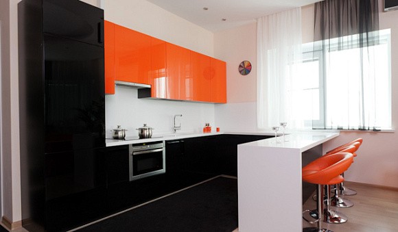 П-образная модель кухни подойдет для большой комнаты. В этом случае кухня цвета глянец займет место сразу возле трех смежных стен. Такая планировка отличается функциональностью, комфортностью и вместительностью.