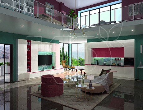 • Эстетичностью. Модель с блестящими фасадами сделает интерьер привлекательным и современным. Подобные комплекты выполняют в разных стилях – хай-тек, модерн, арт-деко, лофт, минимализм.