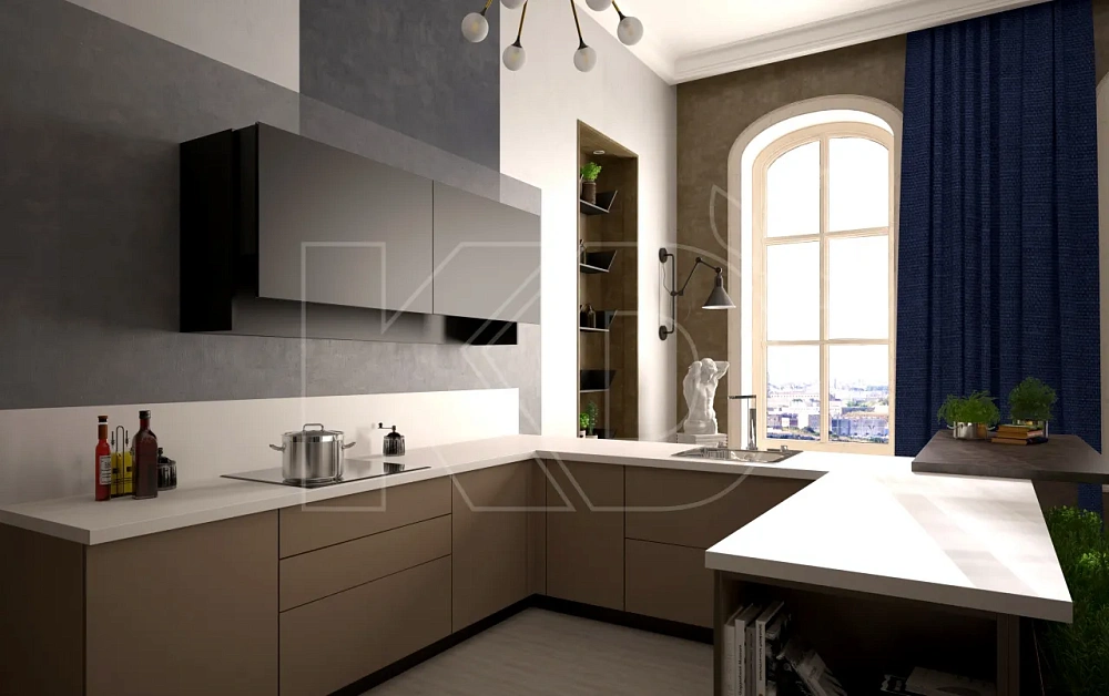 В просторных квартирах-студиях и отдельных помещениях площадью от 12 квадратных метров часто используют островные комплекты. Модули при такой планировке устанавливают вдоль одной или двух стен, в виде буквы П. Дополнительные навесные полки и шкафы часто размещают у окна.