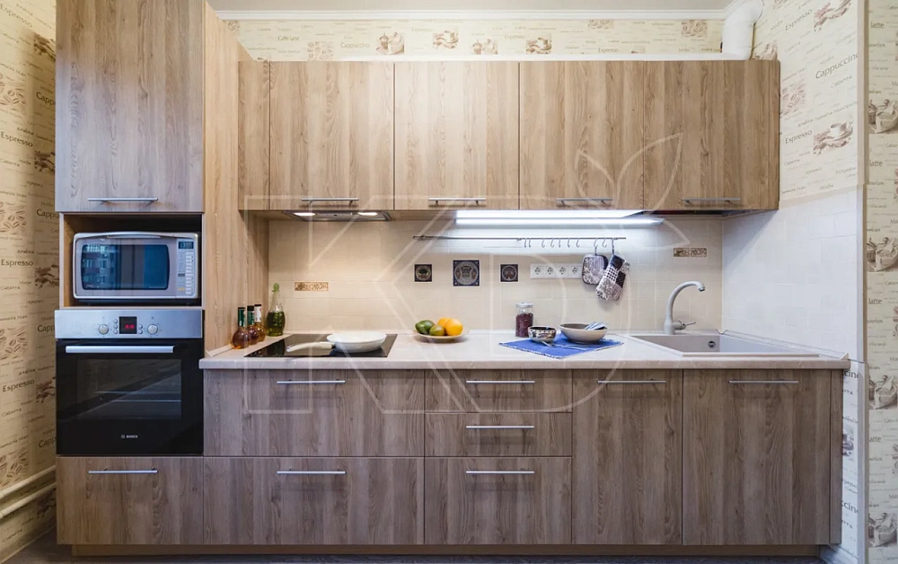 Прямые кухни - такая планировка подразумевает установку модулей вдоль одной из стен. Это наиболее подходящий вариант для небольших помещений. При линейной расстановке нижние модули оснащают выдвижными полками, ящиками с распашными фасадами. А вот верхний ярус часто делают открытым. Дело в том, что навесные полки не затеняют пространство, визуально делают его более просторным.