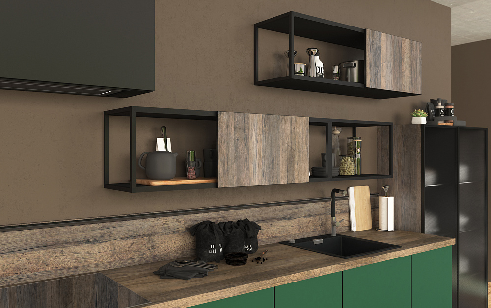 - кухонный гарнитур с контрастными решениями, фигурными вставками на дверцах и раздвижных створках;