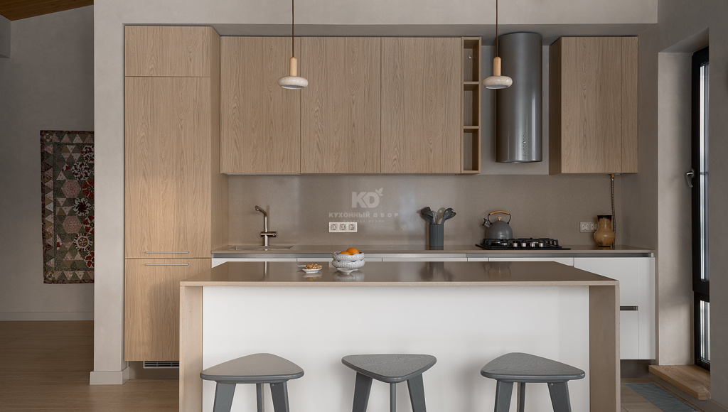 Интерьер не спорит с пейзажем за панорамными окнами, а становится его эхом. Когда за стеклом замирает лес, кухня превращается в мягкую раму для этой живой картины. Цветовая палитра — это диалог рассветных сумерек и пробуждающейся природы: молочные фасады, словно легкая дымка, растворяются в теплых фактурах светлого дерева.