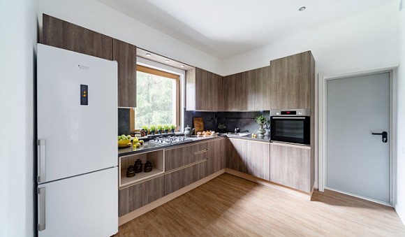 Любители простых форм и линий выберут скандинавский коричневый кухонный гарнитур. Скандинавские кухни обычно дополняют лаконичными деталями, а также стеклянными вставками и открытыми полками контрастного цвета.