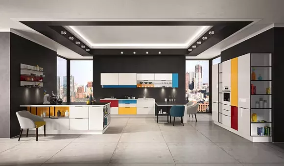Зрительное уменьшение помещение. Большое количество яркой мебели для кухни делает маленькую кухню визуально меньше.