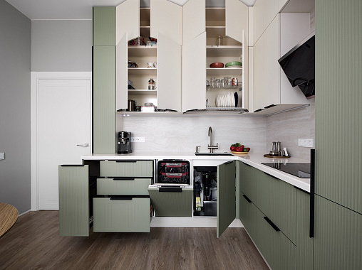 Иногда стандартные модульные кухни это не лучший вариант. Особенно это касается небольших помещений, нестандартных планировок и объединённых пространств. В таких случаях индивидуальный заказ позволяет максимально эффективно использовать площадь и создать кухню на заказ по индивидуальным размерам, идеально вписывающуюся в интерьер.