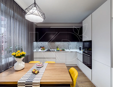 Сегодня популярностью пользуются кухни с фотопечатью. Благодаря современным технологиям возможно использовать печать различных изображений и для оформления мебели, и для декора фартука. Можно выбрать принт абсолютно любой тематики: флористический, анималистический, в виде натюрмортов, репродукций картин, орнамента. Выполненные в стиле модерн черно-белые кухни в цветах смотрятся особенно эффектно.
