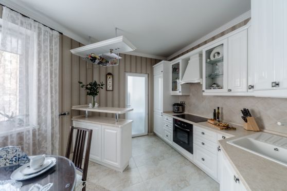 Если вы решили купить кухню в стиле неоклассика, обязательно учитывайте размеры комнаты. Для компактного пространства подойдет линейный вариант со светлыми фасадами. Такая модель не будет занимать много места, не создаст ощущение перегруженности и затененности.