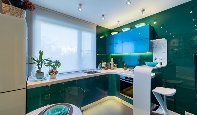 Оттенок фасадов гарнитура способен меняться из-за степени освещенности в комнате. Поверхности могут переливаться зелено-голубыми, сиренево-бирюзовыми, красно-желтыми, оранжево-зелеными и другими цветами.