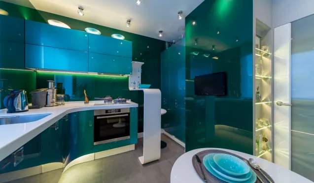 Чаще всего кухонные фасады, которые выполняются в стиле «хамелеон», изготавливаются из МДФ. Они покрываются специальными красками, переливающимися под разными углами. Насыщенность и цвет фасадов зависит от количества света в помещении, а также от направления лучей.