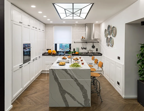 Островная планировка обычно используется в просторных помещениях – квартирах-студиях, загородных домах и кухнях-гостиных. С помощью острова можно визуально отделить зону готовки от места для отдыха. Также он подходит для следующих целей: