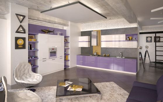 Фиолетовые кухни смотрятся очень привлекательно и необычно. Такой выбор цвета оценит настоящий эстет. Отличным дополнением к такой модели станут матовые стекла на навесных ящиках и декоративная скиналь в виде панели с узорами в скандинавском стиле.