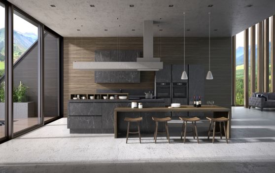 Серые кухни часто выполняют в стилях лофт, хай-тек и модерн. Такая расцветка сочетается с текстурой натурального дерева. Дополнительные элементы подобной версии могут иметь контрастную расцветку. Например, эффектно смотрится графитовая модель с каменной мойкой в бежевых тонах.