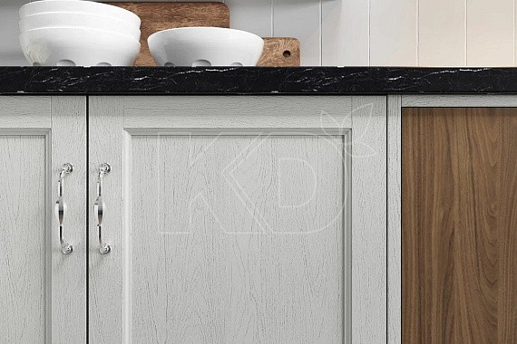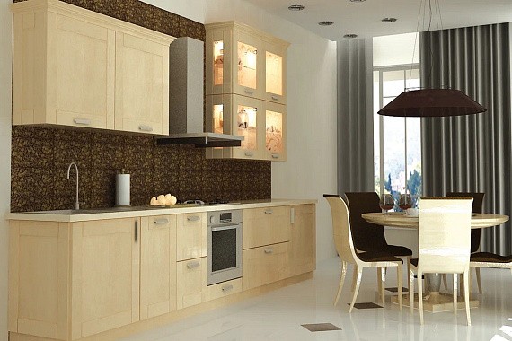 В небольшом пространстве лучше использовать природные материалы. Стены покрасить и отделать панелями из дерева. Полы на кухне уложить массивом, покрыть лаком и покрасить молочной краской. Как вариант – использовать в качестве напольного покрытия керамогранит, имитирующий натуральный камень, или ламинат.