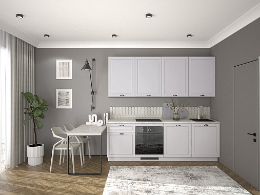 Кухня Лея — компактное готовое решение в классическом стиле, сочетающее элегантный дизайн и абсолютную функциональность. Изящные фасады с рамочной фрезеровкой придают ей нотку утончённости, а до мелочей продуманная конструкция делает её идеальной для небольшого помещения, в котором каждый сантиметр должен быть полезным.