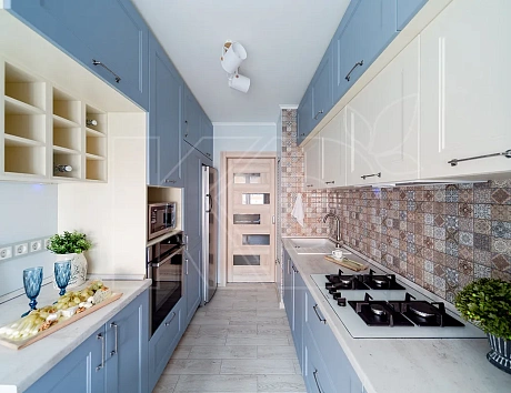 В кухне в стиле неоклассика должны преобладать спокойные оттенки, максимально приближенные к природным. В качестве основного подойдут пудровый, молочный, персиковый, светло-зеленый, нежно-розовый, небесный, серый и золотистый.