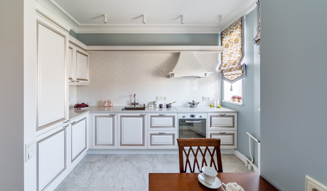 Расстановка углом идеальна для небольшой кухни неоклассика. Систему модулей, объединенная полуостровом или перегородкой, которой может быть, например, барная стойка или столешница, лучше всего применять в просторных квартирах-студиях. А также там, где кухня объединена с гостиной или прихожей.