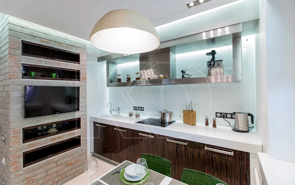 Если помещение совсем небольшое, наоборот, вместо верхних шкафов используют открытые навесные полки. Подобные версии позволяют сохранить свет и воздушность в комнате.