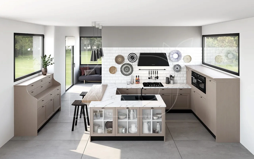 Планировка, при которой модули располагаются в виде буквы «П» вдоль трех смежных стен, обычно используется в больших помещениях. Подобное расположение считается одним из наиболее эргономичных, потому что позволяет придерживаться принципа рабочего треугольника. Холодильник, плита и мойка размещаются на одинаковом друг от друга расстоянии.