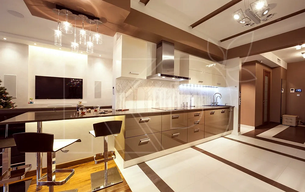 • Высота полуострова должна совпадать с нижним ярусом. При наличии перепада, мебель смотрится не особенно гармонично.