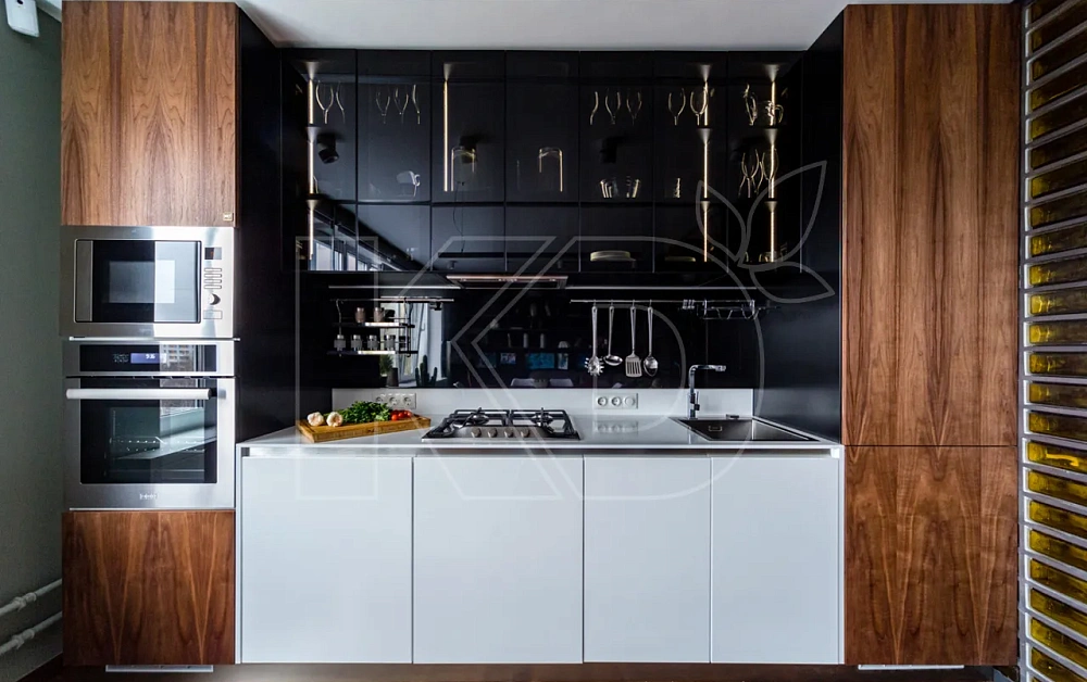 Варочную панель, мойку и холодильник в прямых гарнитурах устанавливают на одной линии на одинаковом расстоянии друг от друга. Благодаря этому обеспечивается комфортность во время готовки.