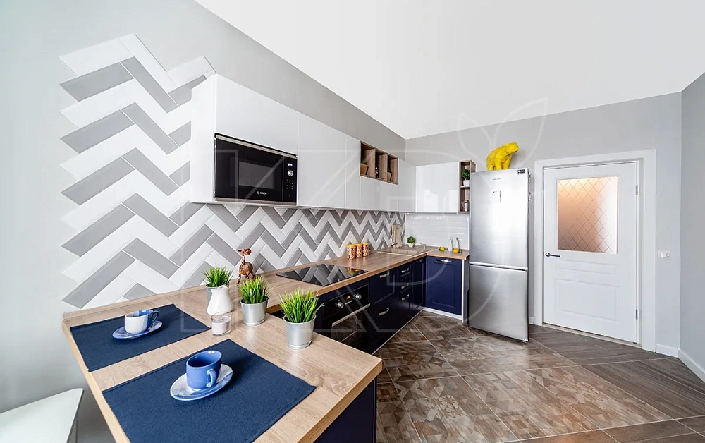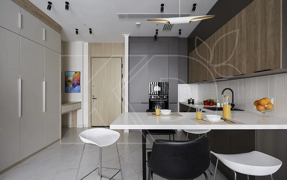 Барная стойка может использоваться в качестве дополнительной рабочей поверхности или обеденного стола. Другой плюс такой конструкции заключается в том, что она может использоваться для зонирования пространства.