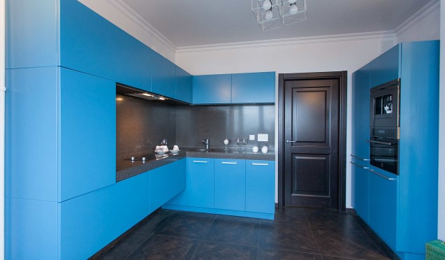 большая синяя кухня выглядит неуютно.