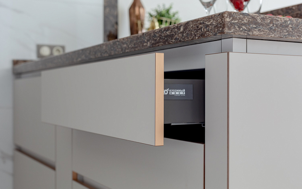 2. Материалы: цена может значительно отличаться в зависимости от того, из чего сделаны фасады, столешница, наполнение шкафчиков и ящиков. Например, фасады из МДФ с покрытием из акриловой краски обойдутся дороже, чем фасады из ламинированной ДСП. Столешницы из камня или искусственного камня стоят дороже столешниц из ламината. Наполнение шкафчиков и ящиков также может варьироваться по цене в зависимости от использованных материалов и механизмов (например, системы плавного закрывания ящиков).