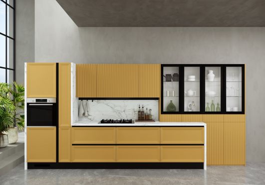 Прямые кухни, встающие в одну линию, включают большое количество разнообразных блоков. Их особенность в том, что нижний и верхний ярус совпадают по длине. Такой гарнитур подходит для узкой прямоугольной кухни.