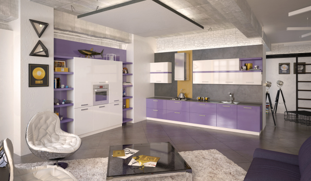 7. Фиолетовые кухни – интерьер может быть обустроен без режима ограничения функциональности. В сочетании с черным цветом и светлой дизайнерской мебелью пространство приобретает роскошный стиль. Современные идеи заимствованы из прошлых веков – в обустройстве задействованы дорогие материалы (бархат, плюш, шелк). Радиусные элементы «сглаживают» углы помещения и создают в кухонном пространстве уютную атмосферу.