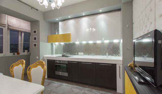 Желтые кухни. Чтобы максимально задействовать пространство, гарнитур должен быть установлен под потолок. В результате оптимизировать пространство можно двухъярусными навесными шкафчиками при условии, что гарнитур не будет соответствовать стандартным параметрам в 60 см.