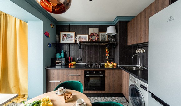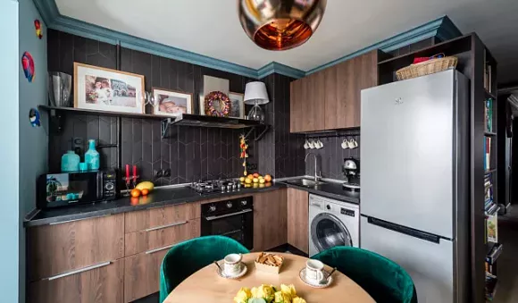 Беспроигрышный вариант – кухонный гарнитур темного цвета и бытовая техника такого же тона. Можно сочетать матовый гарнитур и глянцевую технику. Темная кухня хорошо смотрится с яркой техникой.
