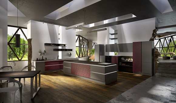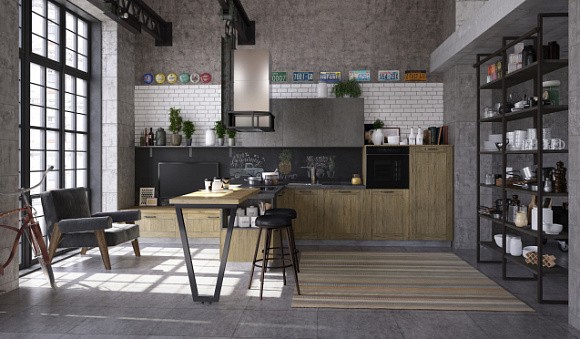 Оформленная в лофте темная кухня может быть разбавлена серыми или красными стенами. Чтобы она не выглядела чересчур мрачно, добавьте в нее света в виде белого, светло-серого, кремового и бежевого оттенков.